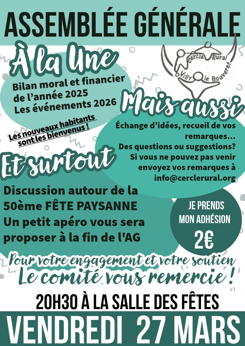 Au programme : bilan moral et financier de l’année 2025, présentation des événements 2026, et surtout une grande discussion autour de la 50ème Fête Paysanne ! Ce sera aussi l’occasion d’échanger vos idées et de partager vos remarques.